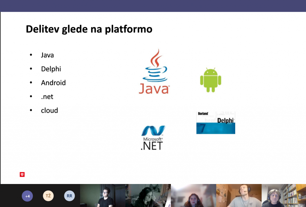 Predstavljena je bila organizacijska struktura podjetja, metodologija razvoja programske opreme in najpomembnejši projekti. Izpostavljen je bil vpliv epidemije na dejavnost podjetja in oddelek. Za naše študente je bila posebej zanimiva tehnološka opredelitev razvoja aplikacij, saj se bodo kmalu na praksi in potem v službi srečali z dilemami okoli pravilne izbire in učinkovite uporabe raznih tehnoloških rešitev. Zelo koristna je bila podrobna predstavitev mobilne aplikacije DRAJV, ker so bile predstavljene vse faze razvoja in testiranj, uporabljene tehnološke rešitve in statistični podatki, ki kažejo na uspešno uporabo v praksi.